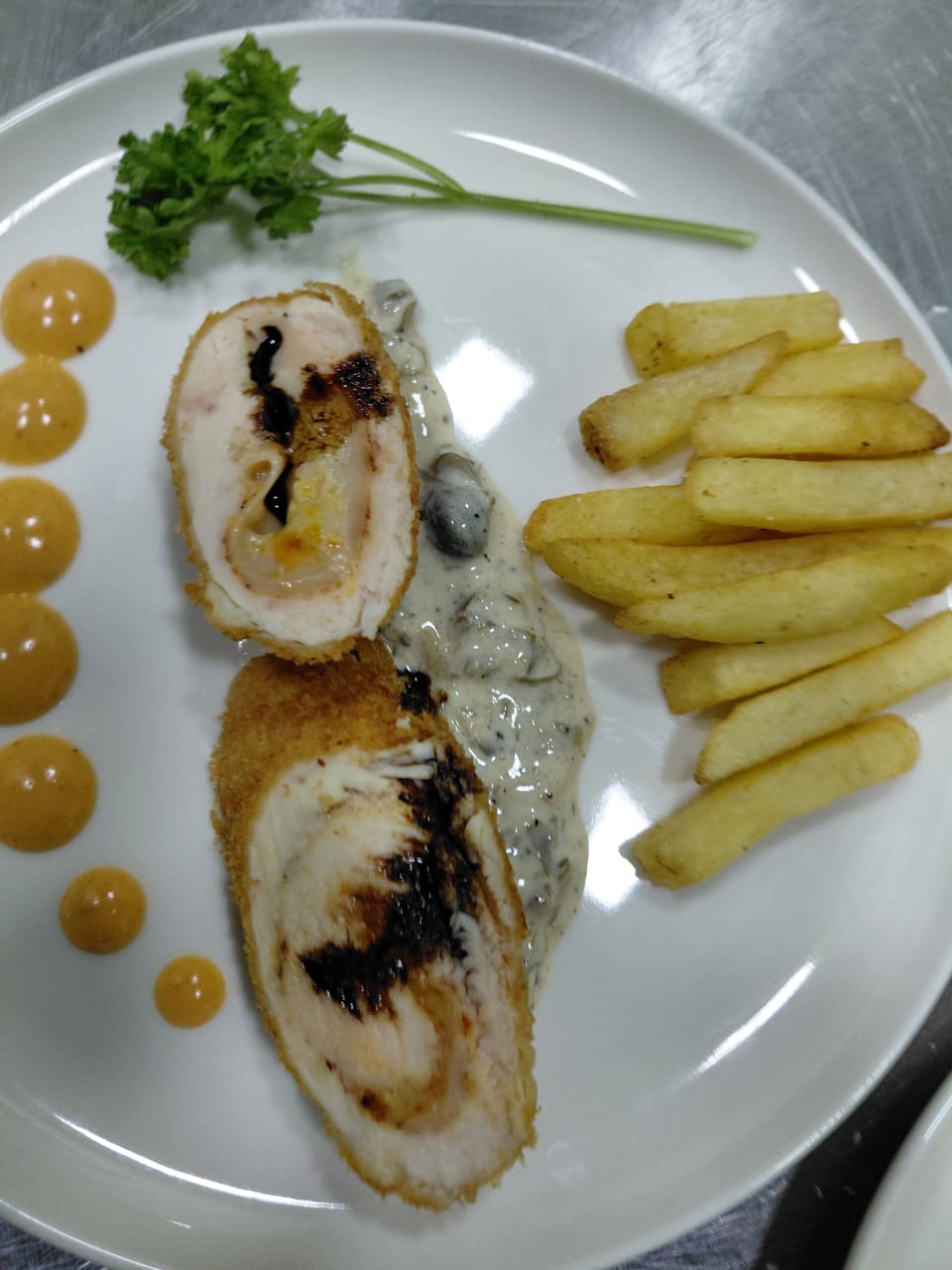 Rolled chicken, ham and cheese served with French fries and creamy dressing
