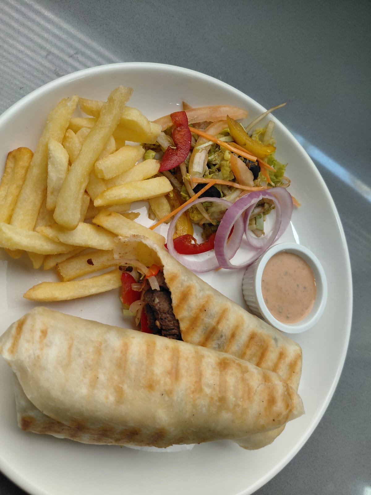 Tender strips of chicken or beef, bell peppers, lettuce with yogurt dressing wrapped in a soft tortilla, served with french frie