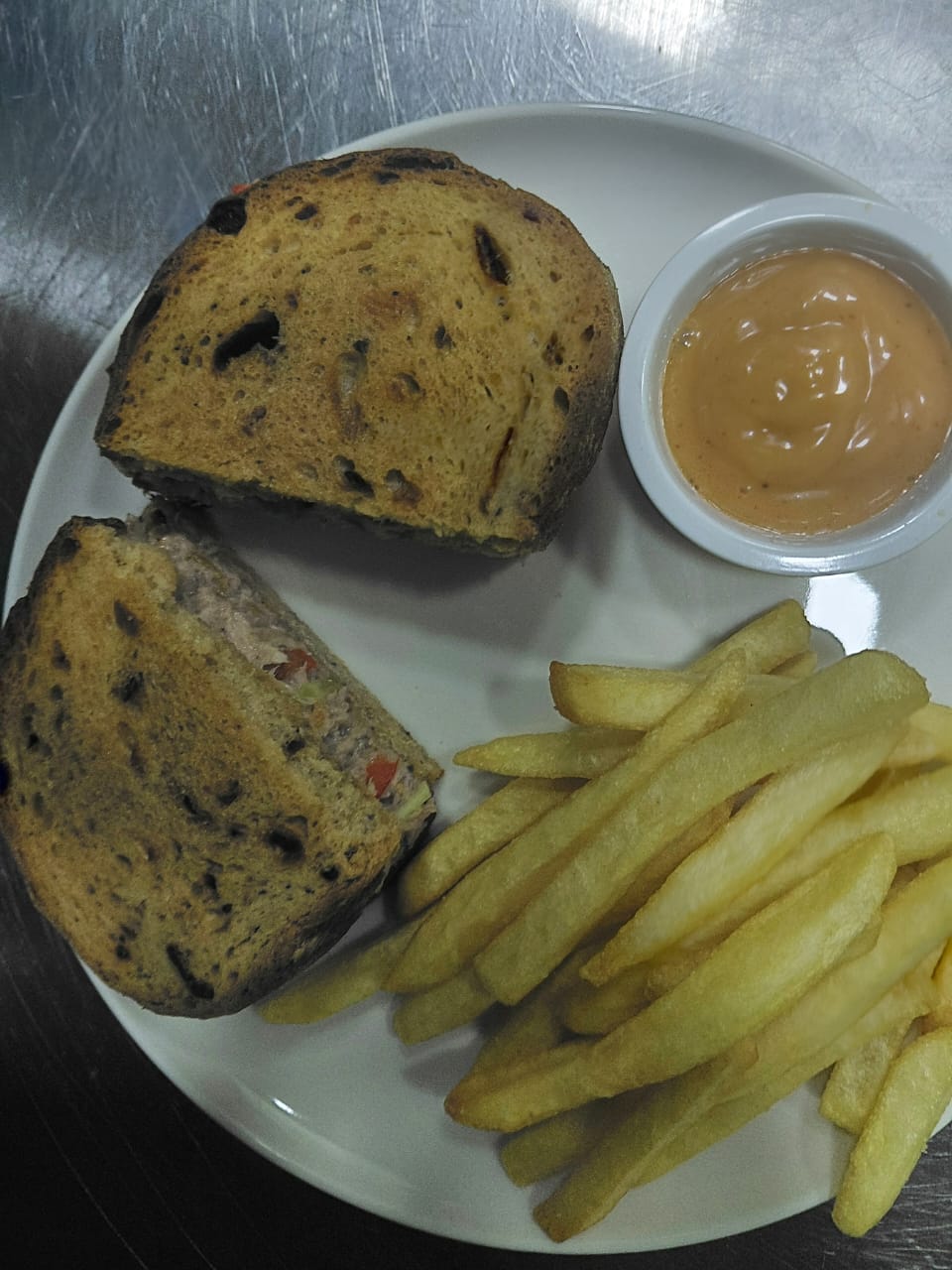 Toasted sourdough bread sandwich served with French fries and sweet chilli sauce. (choice of chicken or tuna)